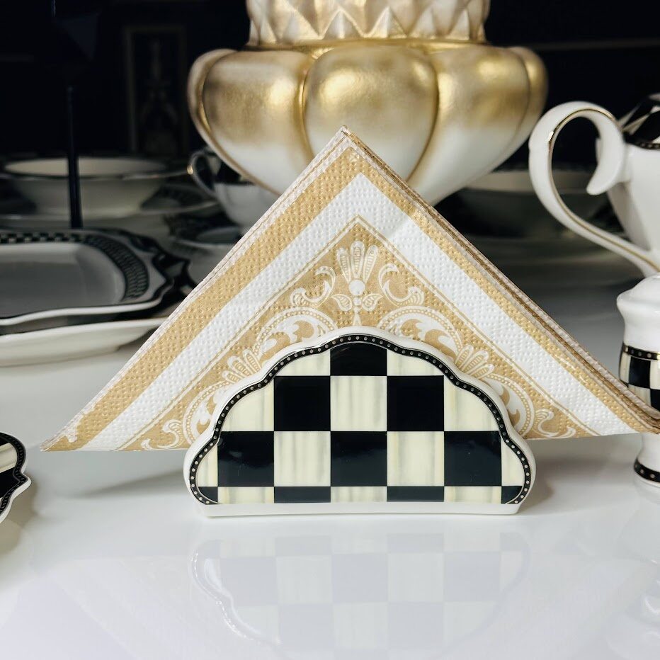 Коллекция ТРИСТАН изготовлена из фарфора. Декор выполнен в современном стиле шахматной доски, с использованием золотых элементов. Коллекция состоит предметов сервировки, чайных и кофейных сервизов