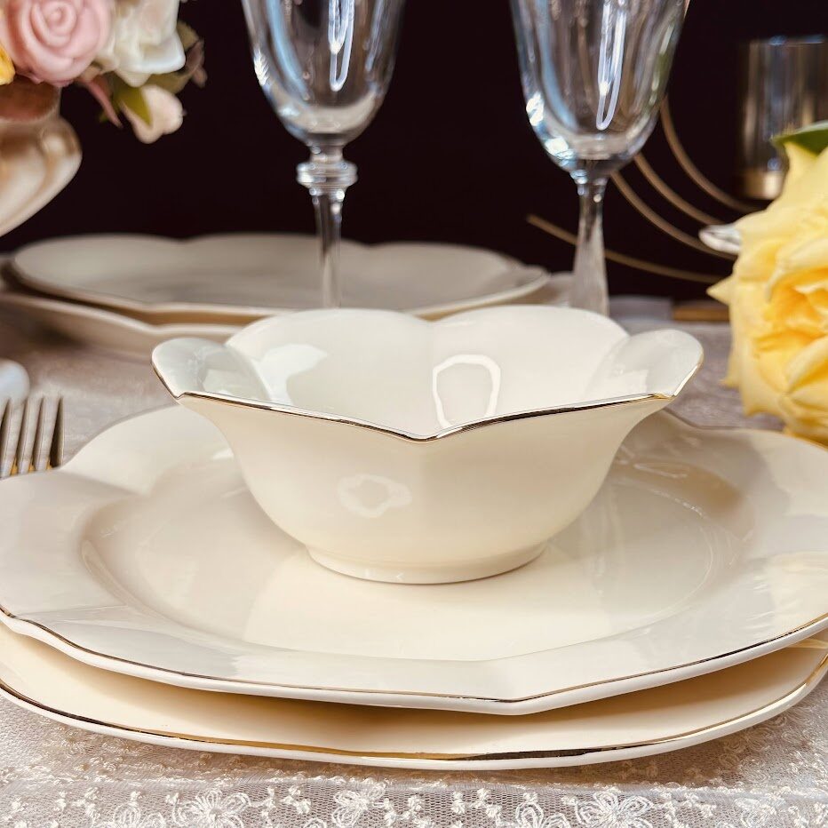 Коллекция МИРАЖ изготовлена из фарфора с глазурью цвета топленного молока. Изящная форма распустившегося цветка и отделка золотом, идеально смотрится в любом интерьере. Коллекция состоит из обеденного сервиза и предметов сервировки. Упаковано в подарочную коробку Материал: фарфор Не рекомендуется использовать в микроволновой печи и мыть в посудомоечной машине, по причине возможного повреждения золотого декоративного покрытия.