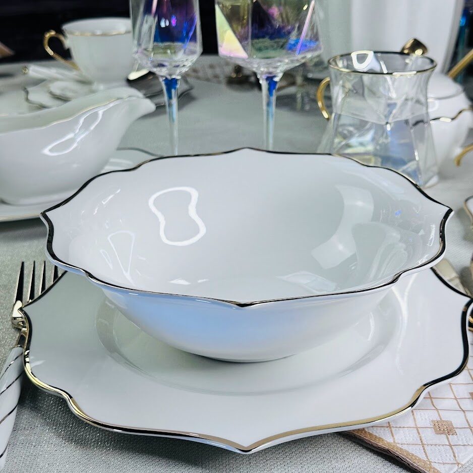 Коллекция посуды MAGNOLIA выполнена из белоснежного фарфора. Ее отличают оригинальная и изящная форма в виде распустившегося цветка, классическая отводка золотом или серебром, широкий борт. Ассортимент: сервизы, отдельные предметы сервировки. Материал: фарфор Не рекомендуется использовать в микроволновой печи и мыть в посудомоечной машине, по причине возможного повреждения золотого декоративного покрытия.