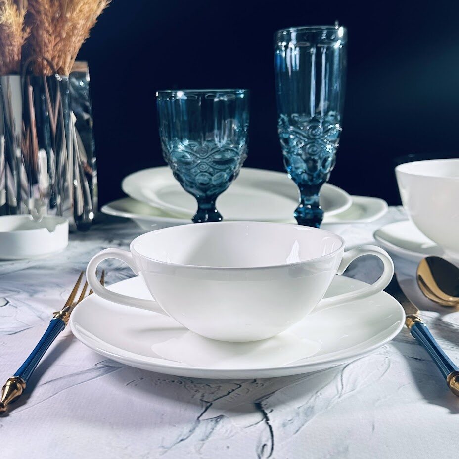 Коллекция ATLANT изготовлена из тонкого костяного фарфора. Белый костяной фарфор идеально подходит для повседневного использования, для сервировки праздничного стола, для ресторанов и отелей. Посуда легкая, легко моется, можно использовать в микроволновой печи и посудомоечной машине. Материал костяной фарфор