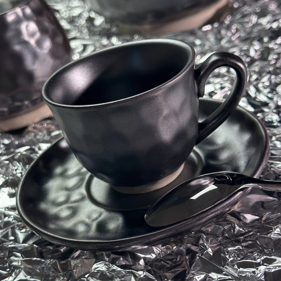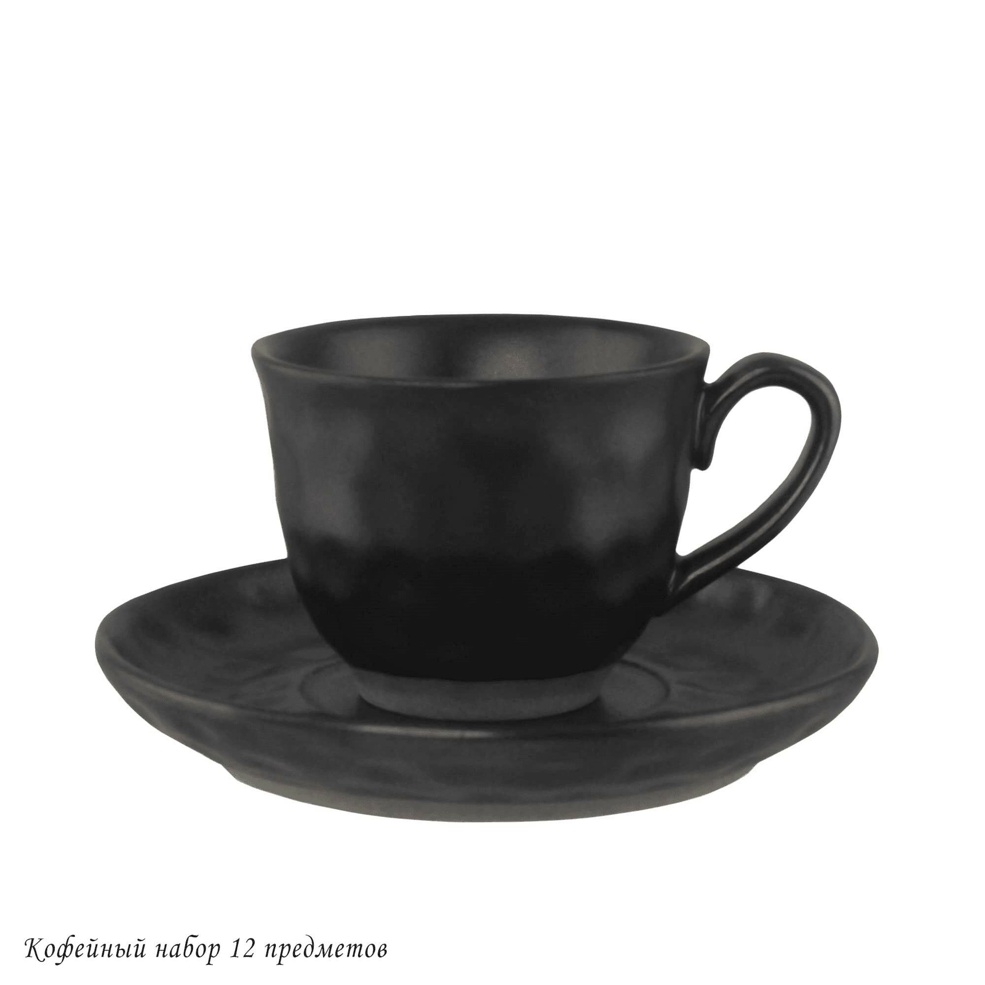 Кофейный набор 12пр. 130 мл Коллекция ROCA выполнена из фарфора, покрытого черной матовой эмалью с отливом, с неровной и объемной поверхностью. Дно кружек, чашек, форм и салатников выполнено из грубой керамики, придавая посуде оригинальность и неповторимы стиль. Посуда прекрасно подходит как для ресторанов, так и для домашнего использования.