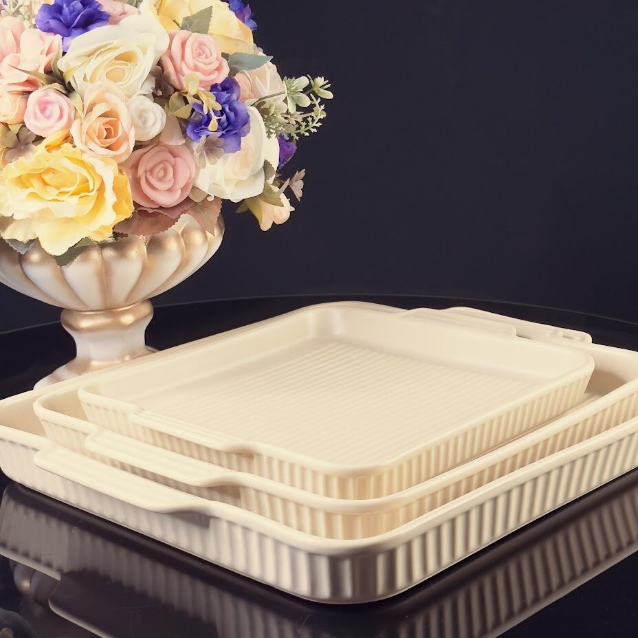 Жаропрочный фарфор - серия представлена в виде прямоугольных, квадратных, овальных и круглых блюд разного объема, круглых кастрюль и порционных формочек. Посуду можно использовать в духовке и микроволновой печи. Пища при этом сохраняет естественный вкус и аромат. Посуду можно мыть в посудомоечной машине, а качественная и прочная глазурь защищает блюда от царапин ножа и вилки. ВНИМАНИЕ! Температура приготовления пищи в посуде из фарфора не должна превышать t220C градусов. Категорически запрещается ставить посуду на конфорки электрической плиты или на открытое пламя. Посуду, в которой находились замороженные или охлажденные продукты, не следует сразу из холодильника помещать в горячую духовку.