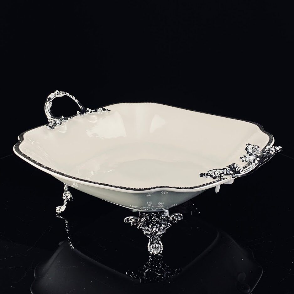 Коллекция посуды ATLANTIS изготовлена из фарфора, с рельефным краем и серебряной окантовкой. Изящные ручки и ножки изготовлены из облегчённого метала с качественным серебряным покрытием. Упаковано в подарочную коробку Материал: фарфор Не рекомендуется использовать в микроволновой печи и мыть в посудомоечной машине, по причине возможного повреждения декоративного покрытия.