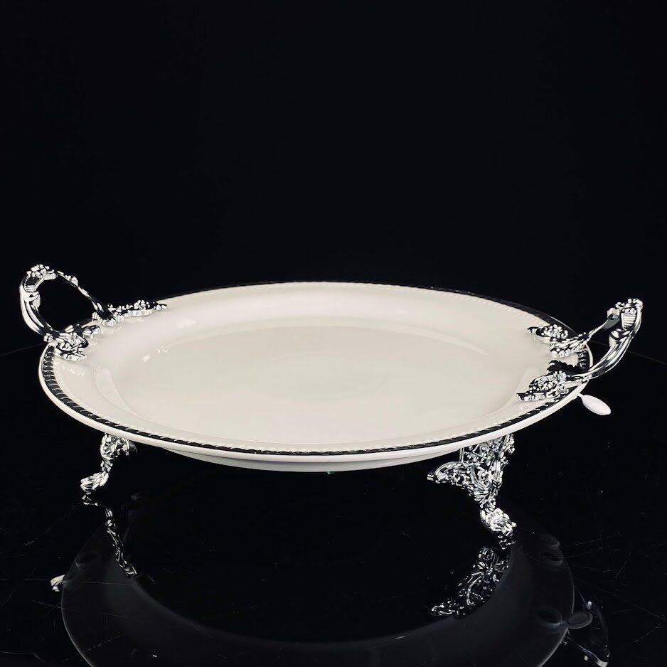 Коллекция посуды ATLANTIS изготовлена из фарфора, с рельефным краем и серебряной окантовкой. Изящные ручки и ножки изготовлены из облегчённого метала с качественным серебряным покрытием. Упаковано в подарочную коробку Материал: фарфор Не рекомендуется использовать в микроволновой печи и мыть в посудомоечной машине, по причине возможного повреждения декоративного покрытия.