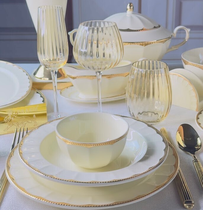 Изысканная коллекция посуды из фарфора ИМПЕРИАЛ ЗОЛОТО, выполнена в классическом дизайне, с глазурью цвета топленного молока. Золотой декор подчеркивает благородный цвет посуды. коллекция представлена сервизами, отдельными предметами, чайными наборами и сервизами.
