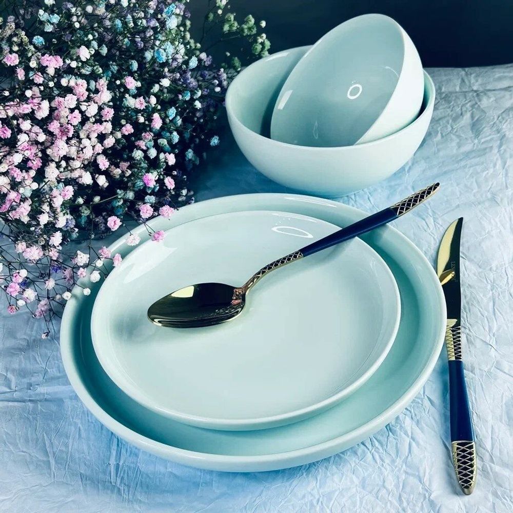 Наполнение: 6шт Салатник 12,5х6 см, 400 мл 6шт Миска 15х7 см, 700 мл 6шт Обеденная тарелка 19х3,5см 6шт Десертная тарелка 23х3,5см Материал: фарфор Можно использовать в микроволновой печи и мыть в посудомоечной машине, по причине возможного повреждения золотого декоративного покрытия.