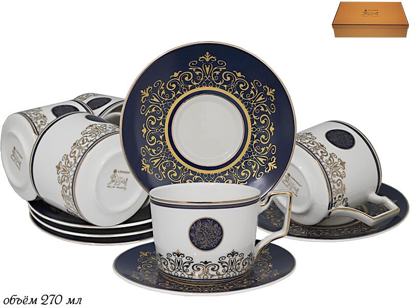 Упаковано в подарочную коробку Наполнение: 6шт чашки 250 мл 6шт блюдца Материал: фарфор Не рекомендуется использовать в микроволновой печи и мыть в посудомоечной машине, по причине возможного повреждения золотого декоративного покрытия.