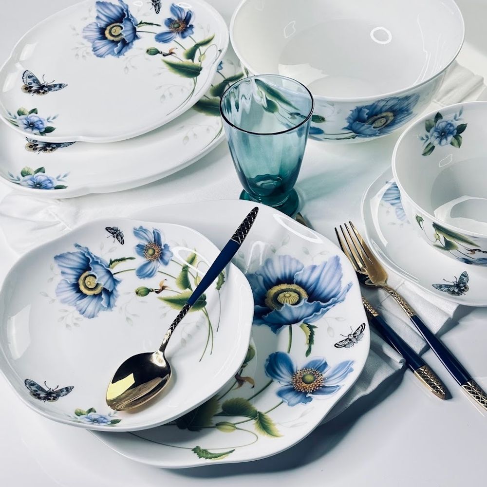 Наполнение: 6шт тарелки 27 см 6шт тарелки 20,5 см 6шт тарелка глубокая 20,5 см 2шт салатники 16х8,5 см 1шт салатник 21,5 см 1шт блюдо овальное 25х19х2,5 см 1шт блюдо овальное 30,5х21х3 см Материал: костяной фарфор Можно использовать в микроволновой печи и мыть в посудомоечной машине,