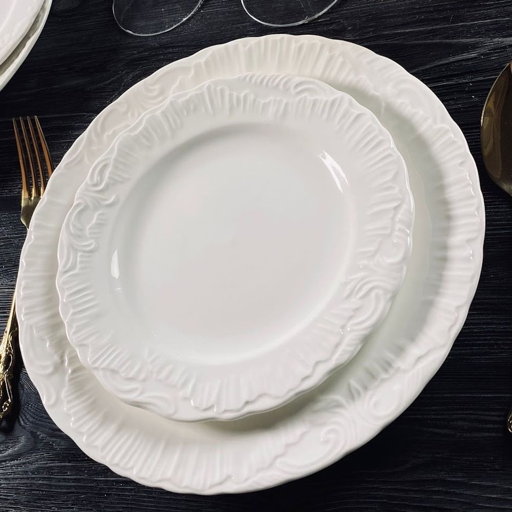 Коллекция посуды АВРОРА изготовлена из белоснежного фарфора. Посуда выполнена в классическом европейском дизайне, с использованием рельефного рисунка. Посуда без золотой отделки, что позволяет использовать ее как дома, так и в ресторанах. Широкая линейка предметов сервировки: тарелки, блюда, фруктовницы, в нескольких размерах, позволяют сервировать стол в едином стиле. В коллекции представлены все размеры тарелок, чайные и кофейные наборы, сервизы. Материал: фарфор Можно использовать в посудомоечной машине при температуре не выше 60 градусов, безиспользования агрессивных моющих средств. Можно использовать в микроволновой печи