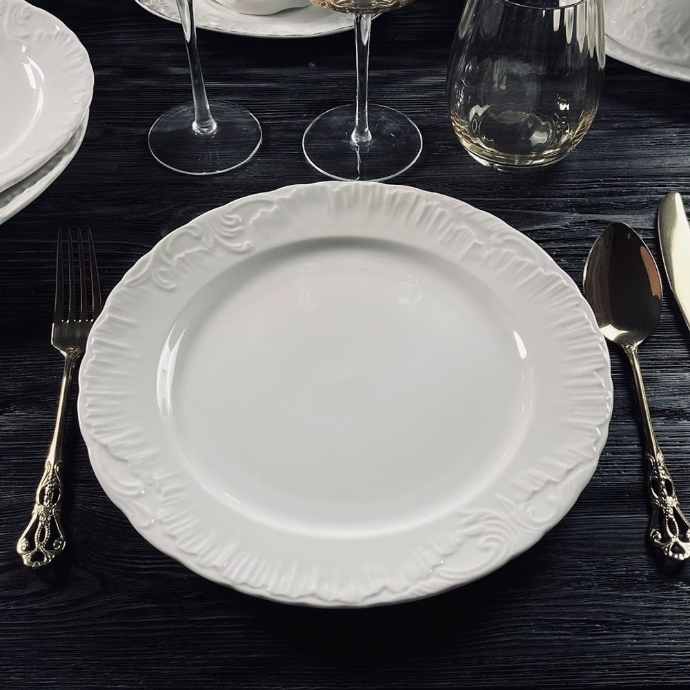 Коллекция посуды АВРОРА изготовлена из белоснежного фарфора. Посуда выполнена в классическом европейском дизайне, с использованием рельефного рисунка. Посуда без золотой отделки, что позволяет использовать ее как дома, так и в ресторанах. Широкая линейка предметов сервировки: тарелки, блюда, фруктовницы, в нескольких размерах, позволяют сервировать стол в едином стиле. В коллекции представлены все размеры тарелок, чайные и кофейные наборы, сервизы. Материал: фарфор Можно использовать в посудомоечной машине при температуре не выше 60 градусов, безиспользования агрессивных моющих средств. Можно использовать в микроволновой печи