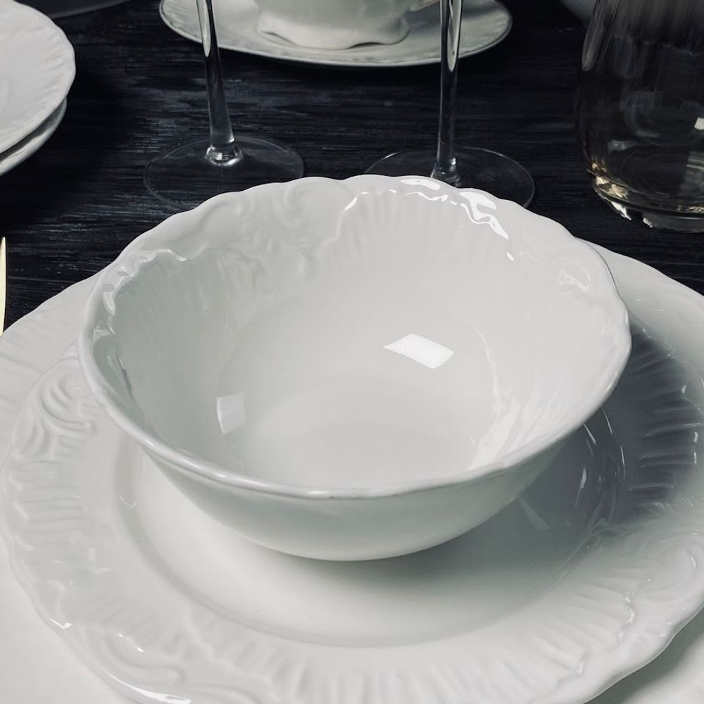 Коллекция посуды АВРОРА изготовлена из белоснежного фарфора. Посуда выполнена в классическом европейском дизайне, с использованием рельефного рисунка. Посуда без золотой отделки, что позволяет использовать ее как дома, так и в ресторанах. Широкая линейка предметов сервировки: тарелки, блюда, фруктовницы, в нескольких размерах, позволяют сервировать стол в едином стиле. В коллекции представлены все размеры тарелок, чайные и кофейные наборы, сервизы. Материал: фарфор Можно использовать в посудомоечной машине при температуре не выше 60 градусов, безиспользования агрессивных моющих средств. Можно использовать в микроволновой печи