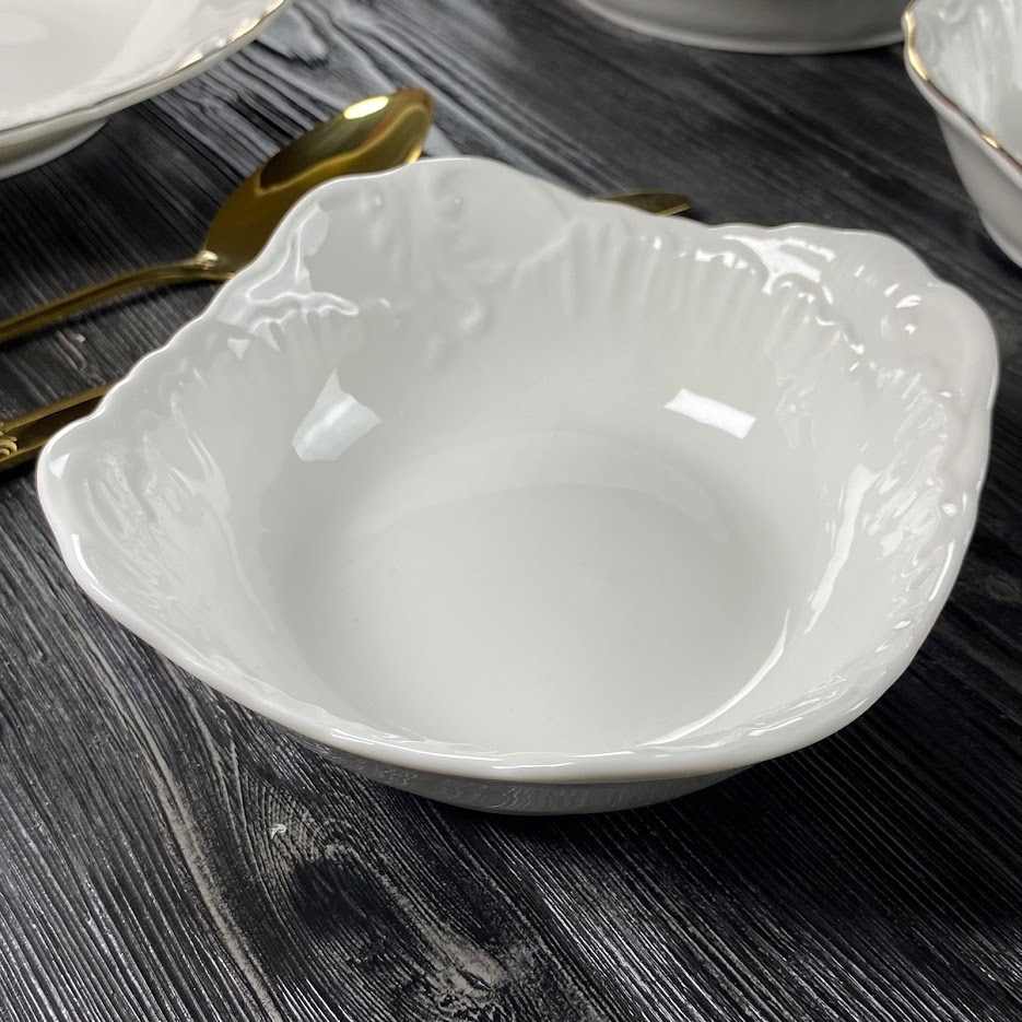 Коллекция посуды АВРОРА изготовлена из белоснежного фарфора. Посуда выполнена в классическом европейском дизайне, с использованием рельефного рисунка. Посуда без золотой отделки, что позволяет использовать ее как дома, так и в ресторанах. Широкая линейка предметов сервировки: тарелки, блюда, фруктовницы, в нескольких размерах, позволяют сервировать стол в едином стиле. В коллекции представлены все размеры тарелок, чайные и кофейные наборы, сервизы. Материал: фарфор Можно использовать в посудомоечной машине при температуре не выше 60 градусов, безиспользования агрессивных моющих средств. Можно использовать в микроволновой печи