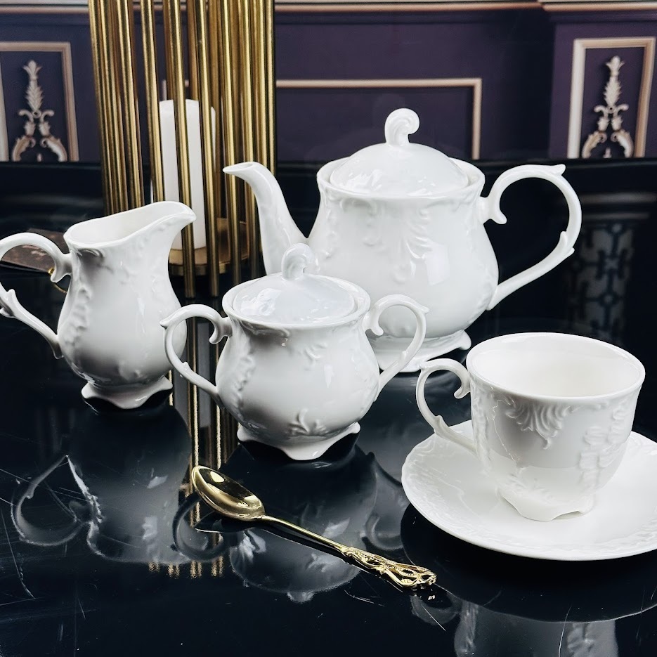 Коллекция посуды АВРОРА изготовлена из белоснежного фарфора. Посуда выполнена в классическом европейском дизайне, с использованием рельефного рисунка. Посуда без золотой отделки, что позволяет использовать ее как дома, так и в ресторанах.