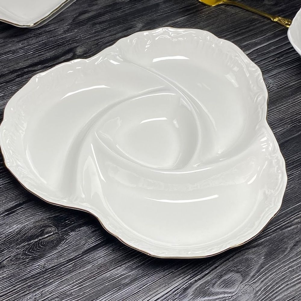Коллекция посуды АВРОРА ЗОЛОТО изготовлена из белоснежного фарфора. Посуда выполнена в классическом европейском дизайне, с использованием рельефного рисунка. Край декорированаккуратной золотой обводкой,