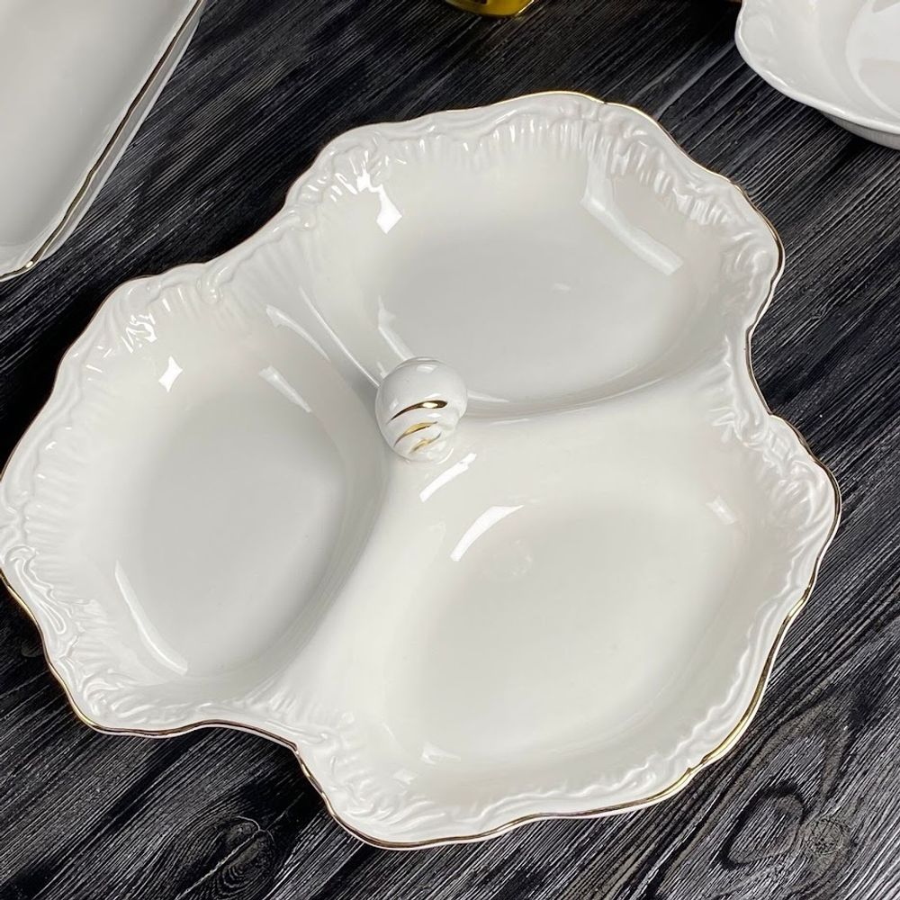 Коллекция посуды АВРОРА ЗОЛОТО изготовлена из белоснежного фарфора. Посуда выполнена в классическом европейском дизайне, с использованием рельефного рисунка. Край декорированаккуратной золотой обводкой,