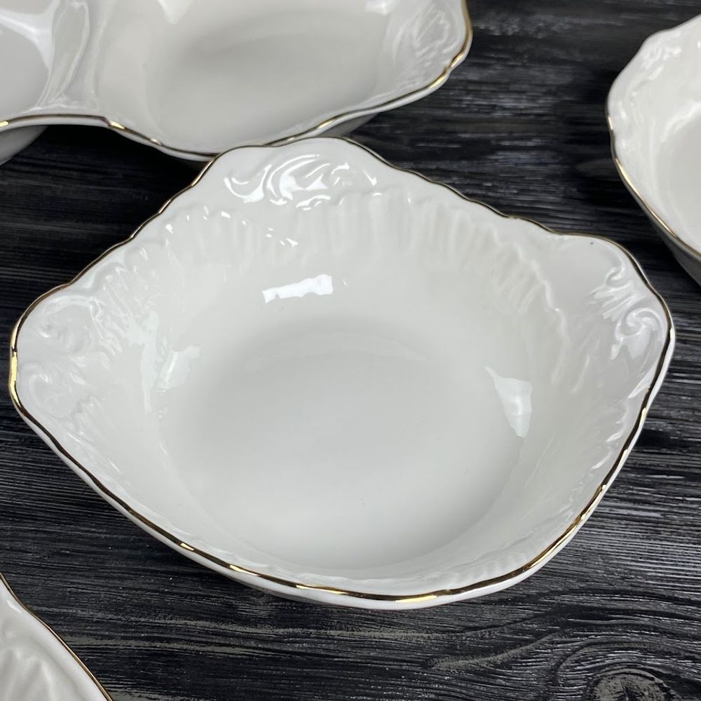Коллекция посуды АВРОРА ЗОЛОТО изготовлена из белоснежного фарфора. Посуда выполнена в классическом европейском дизайне, с использованием рельефного рисунка. Край декорированаккуратной золотой обводкой,