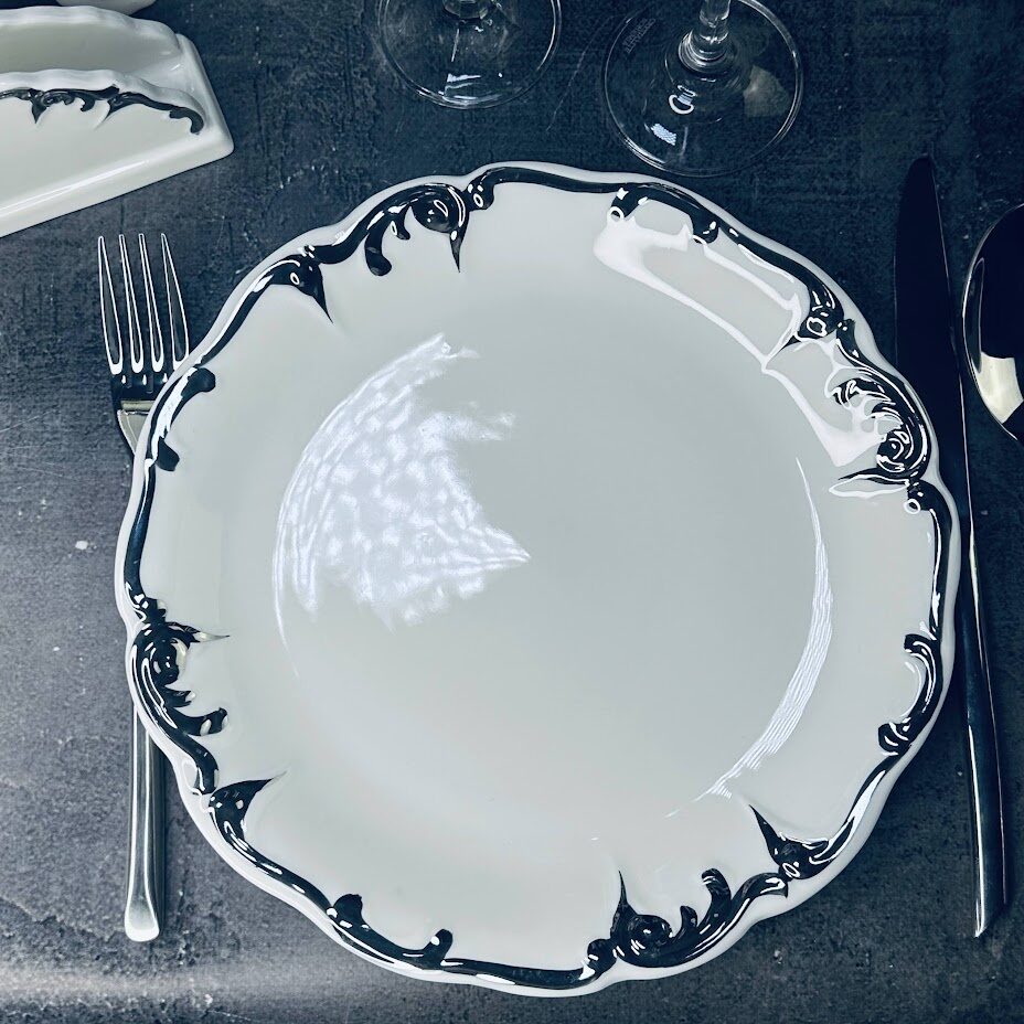 Коллекция ARGENTO изготовлена из белоснежного фарфора. Борт и изделия с рельефной и объемной отделкой серебром. Широкая линейка: тарелки, салатники, блюда, менажныцы, чайный набор и сервиз. Материал: фарфор Не рекомендуется использовать в микроволновой печи и мыть в посудомоечной машине, по причине возможного повреждения золотого декоративного покрытия.