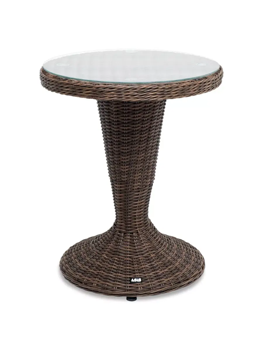 Каркас изготовлен из легкого алюминия и оплетен искусственным ротангом коричневого оттенка. Поверхность столика дополнена стеклянной столешницей из закаленного стекла, толщиной 5 мм.