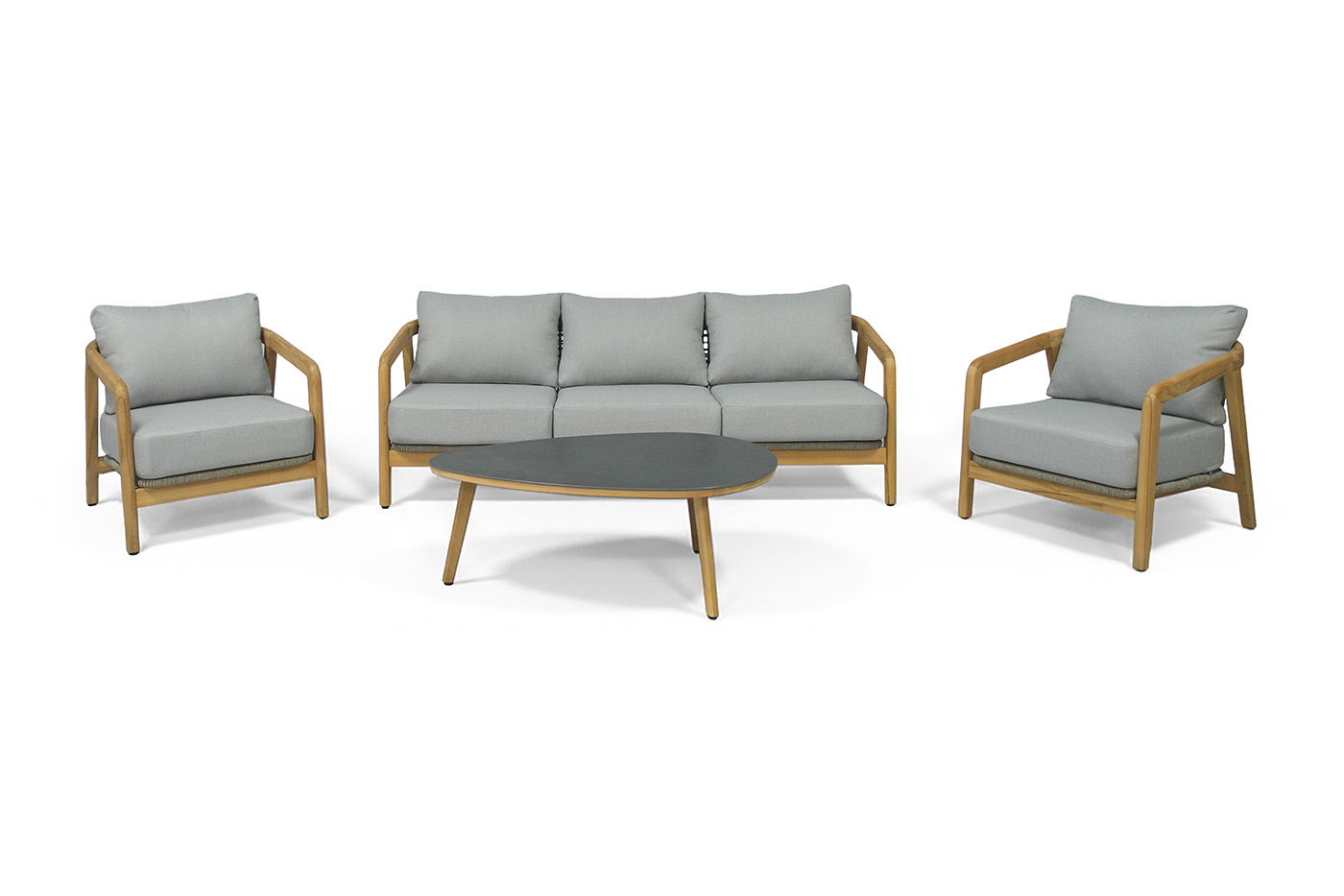 Каркас выполнен из тика — благородной древесины, известной своей прочностью, устойчивостью к внешним воздействиям и изысканной текстурой. Тёплый древесный оттенок подчёркивает природную эстетику мебели.