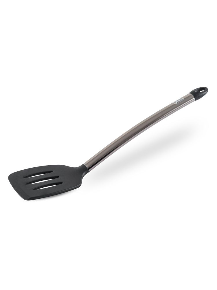 Лопатка с прорезями Gipfel Adelina 6533. Длина 35 см. Лопатка имеет ручку из нержавеющей стали с петлей для подвешивания. Рабочая часть сделана из силикона, что позволит использовать ее со сковородами, имеющими антипригарное покрытие. Широкая поверхность делает ее очень удобной при жарке блинов.