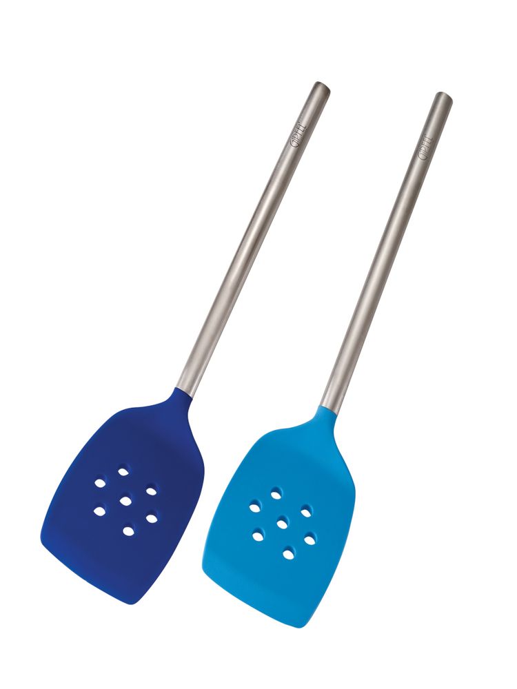 Лопатка с прорезями MOMENTOS 32,2х8,3х3,4 см. Ручка выполнена из нержавеющей стали, лопатка сделана из силикона. Лопатку можно использовать с антипригарной посудой. Цвета в ассортименте: синий или голубой.