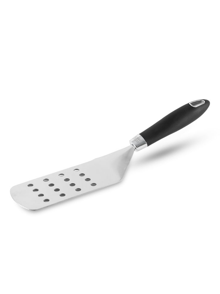 Лопатка с отверстиями GIPFEL MONTEGO 9321. Длина лопатки 33 см. Ручка из термопластичной резины и пластика черного цвета имеет отверстие для подвешивания. Лопатка сделана из нержавеющей стали. Подойдет для сковород из чугуна или нержавеющей стали без покрытия.