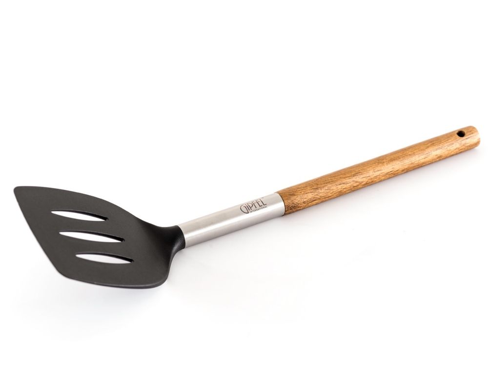 Лопатка с прорезями Gipfel 2788. Длина лопатки 35 см. У лопатки деревянная ручка, сделанная из акации. На ручке отверстие для подвешивания. Рабочая поверхность из нейлона, что позволит использовать лопатку с антипригарной посудой.