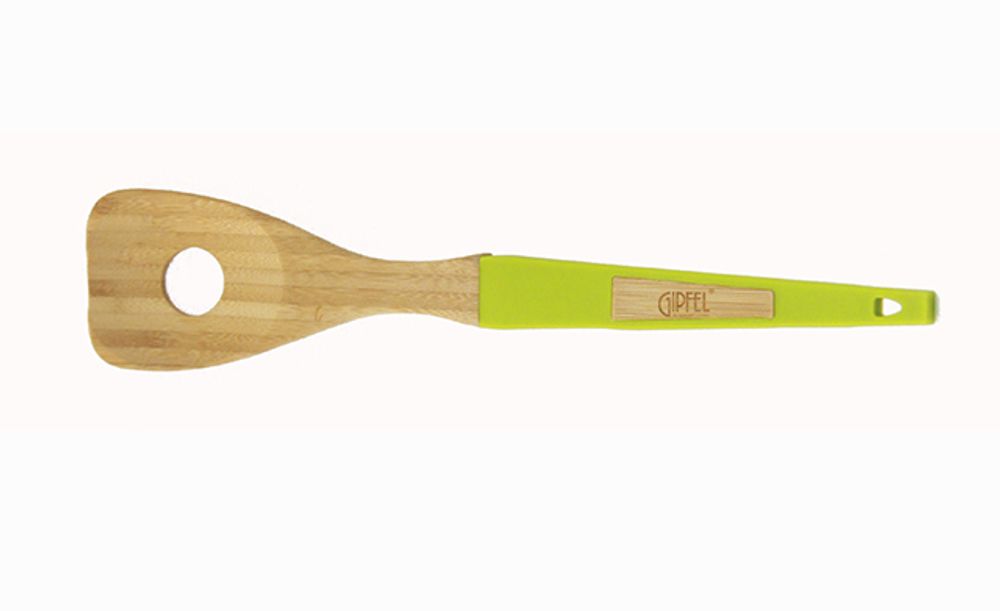 Большая ложка для салата с использованием экологически безопасных материалов и модным цветовым решением. Салатная ложка длиной 32 см выполнена из натурального бамбука. Выполнена в скошенной форме и оснащена отверстием в центральной части, облегчающее размешивание продуктов. Ручка ложи силиконовая, приятная на ощупь и препятствует скольжению. Силикон зеленого цвета выгодно оттеняет благородную фактуру бамбука. Для крепления с помощью крючка верхняя часть ручки оснащена отверстием.