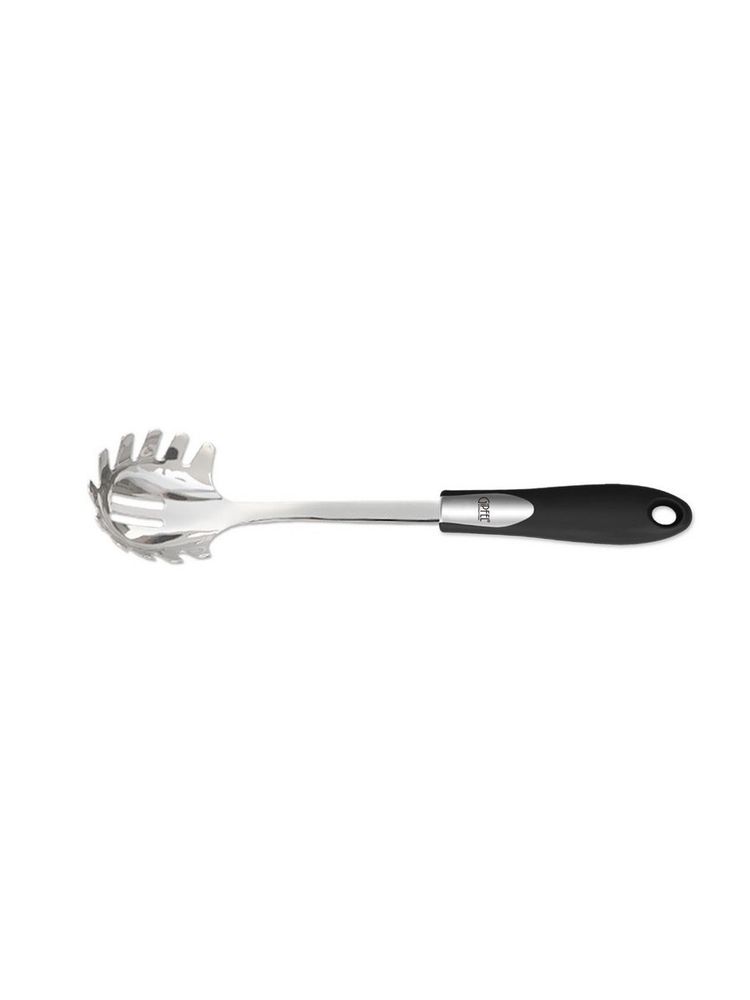 Ложка для спагетти GIPFEL ORBIT 6586. Ложка выполнена из нержавеющей стали с пластиковой ручкой черного цвета. На ручке отверстие для подвешивания. Подойдет для использования с посудой из нержавеющей стали.