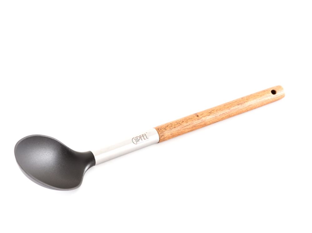 Ложка GIPFEL 2789 размером 34см. Ручка сделана из дерева акации и нержавеющей стали. Рабочая поверхность сделана из нейлона черного цвета. На ручке имеется отверстие для подвешивания.
