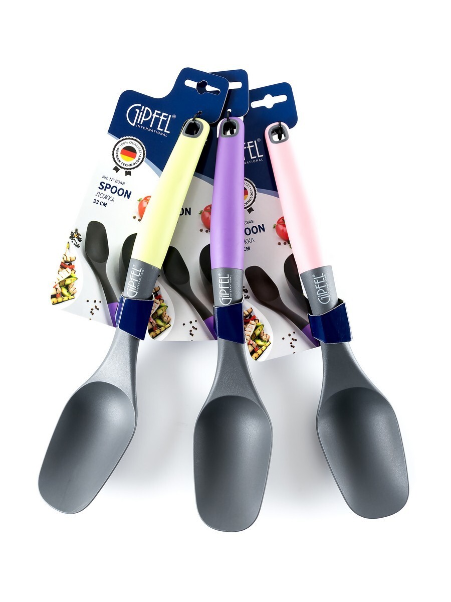 Ложка Gipfel 6348. Длина 33 см. Ложка сделана из нейлона и пластика и прекрасно подойдет для использования с антипригарной посудой. Покрытие ручки 'Soft-touch'. Цвет ручки в ассортименте: зеленый, фиолетовый, розовый.
