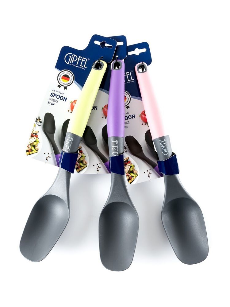 Ложка GIPFEL 6348. Длина 33см. Ложка сделана из нейлона и пластика и прекрасно подойдет для использования с антипригарной посудой. Покрытие ручки 'Soft-touch'. Цвет ручки в ассортименте: зеленый, фиолетовый, розовый.