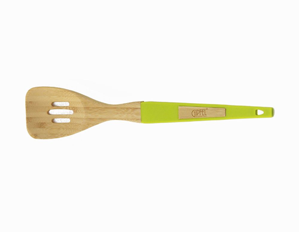Ложка с прорезями Gipfel BELLAVISTA 2023. Рабочая поверхность сделана из бамбука. Ручка с вставками из силикона. Благодаря натуральному дереву, ложка не царапает тефлоновую и стеклянную поверхность посуды.