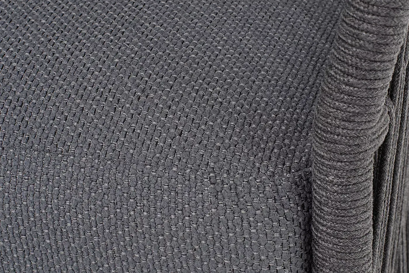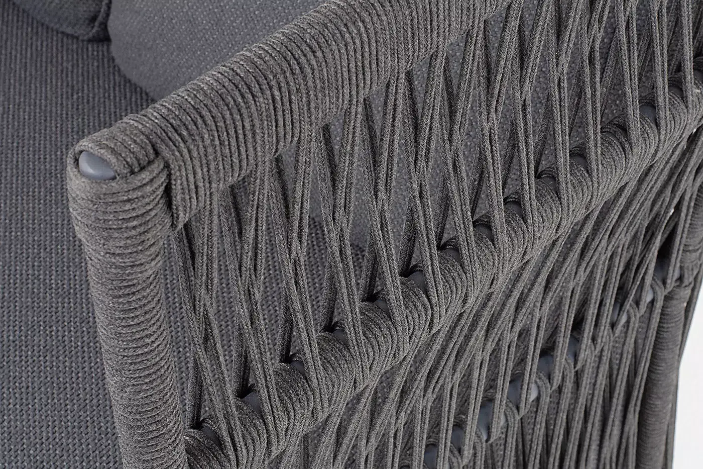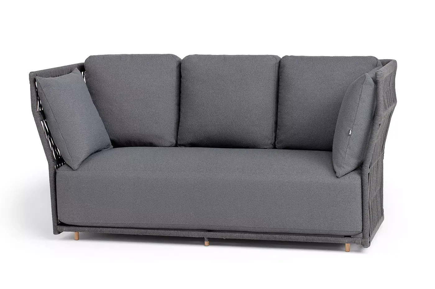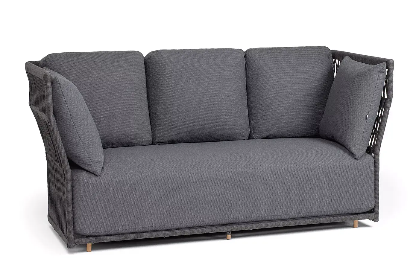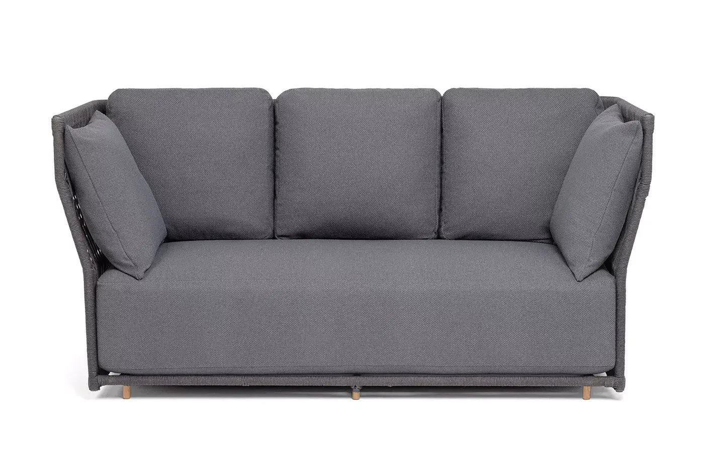 Диван имеет алюминиевый каркас, окрашенный порошковой краской в темно-серый (RAL7024) цвет. Боковины каркаса и спинка вручную оплетены роупом - эластичными синтетическими лентами, изготовленными из высокопрочных полиэфирных волокон. Цвет оплетки в тон каркасу - темно-серый.