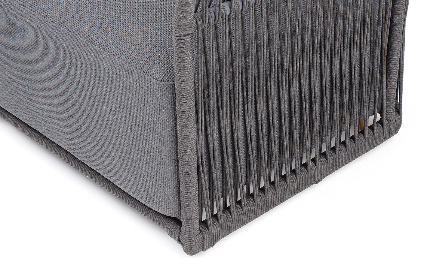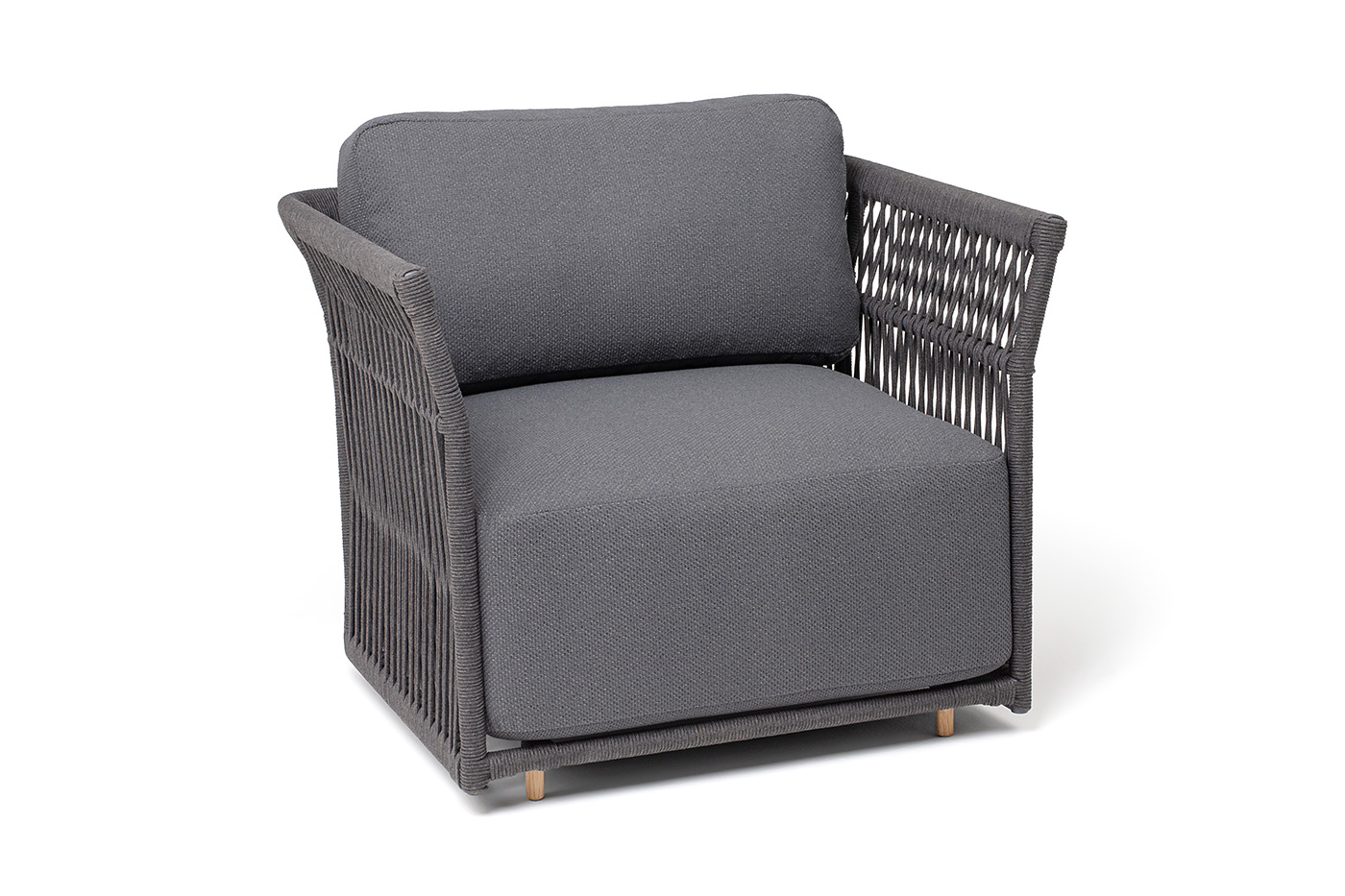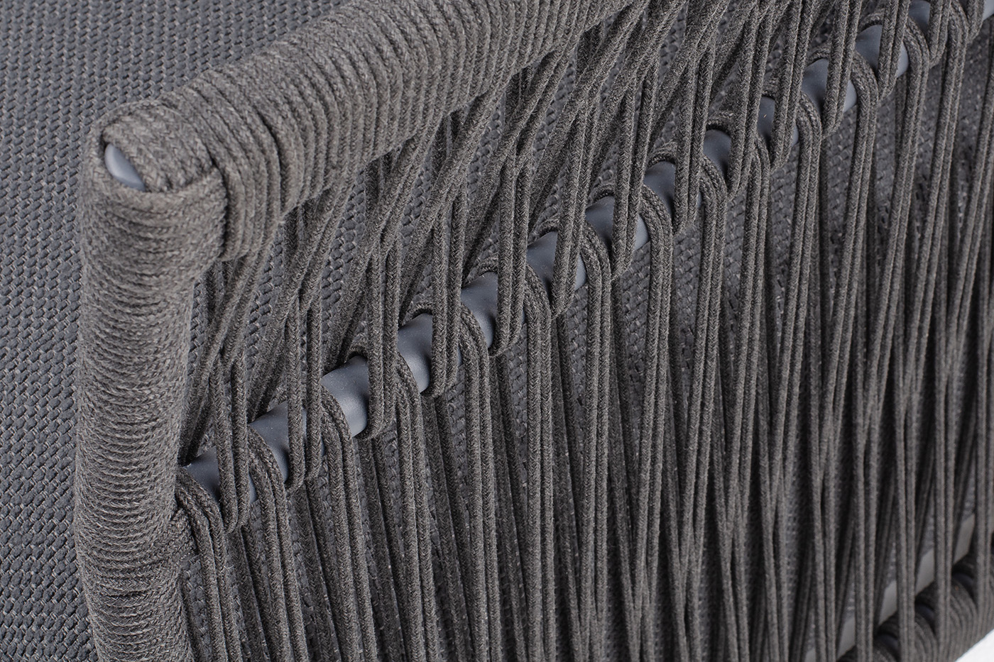 Кресло имеет алюминиевый каркас, окрашенный порошковой краской в темно-серый (RAL7024) цвет. Боковины каркаса и спинка вручную оплетены роупом - эластичными синтетическими лентами, изготовленными из высокопрочных полиэфирных волокон. Цвет оплетки в тон каркасу - темно-серый. На ножках кресла идут дубовые наконечники (заглушки).