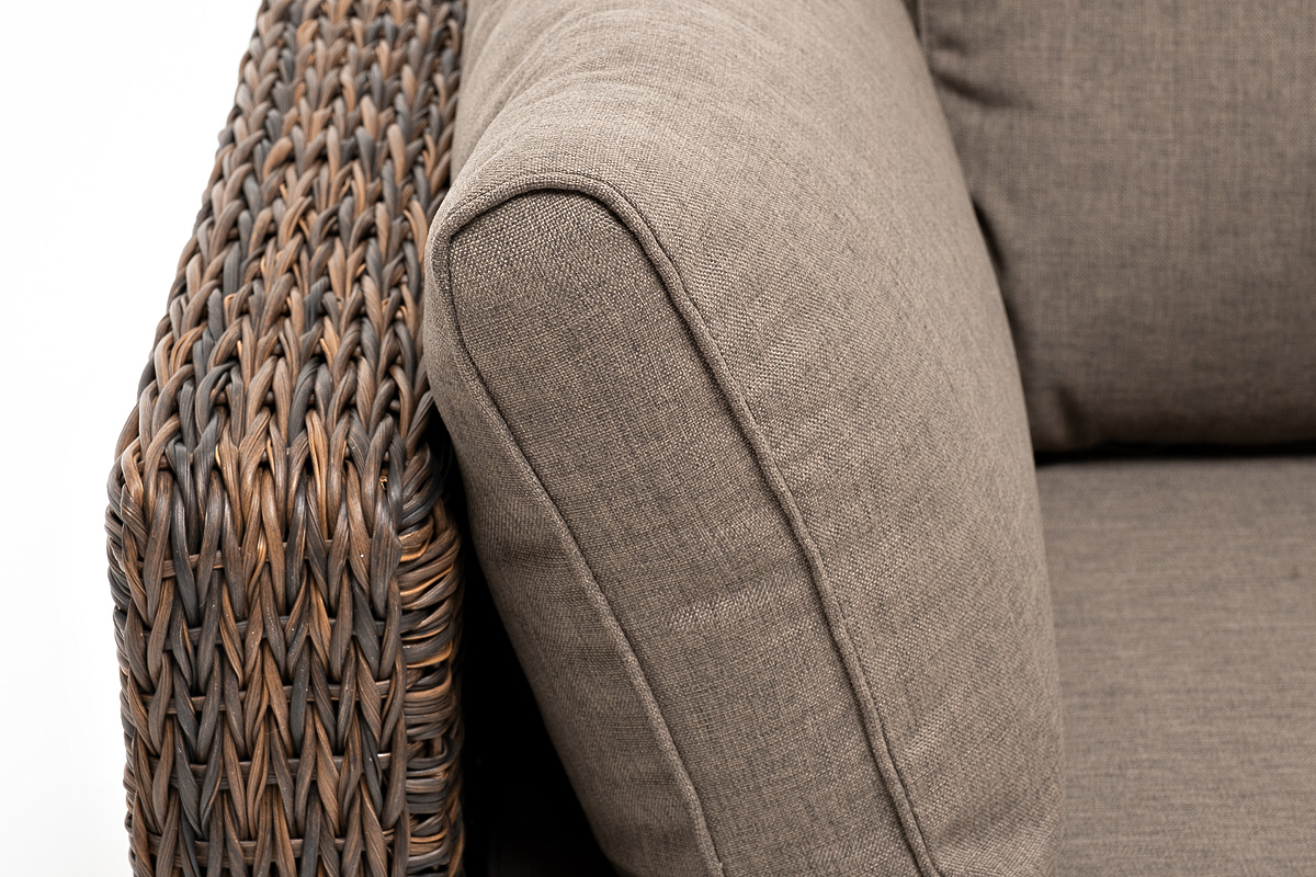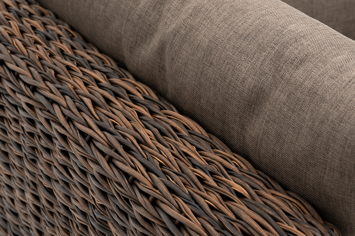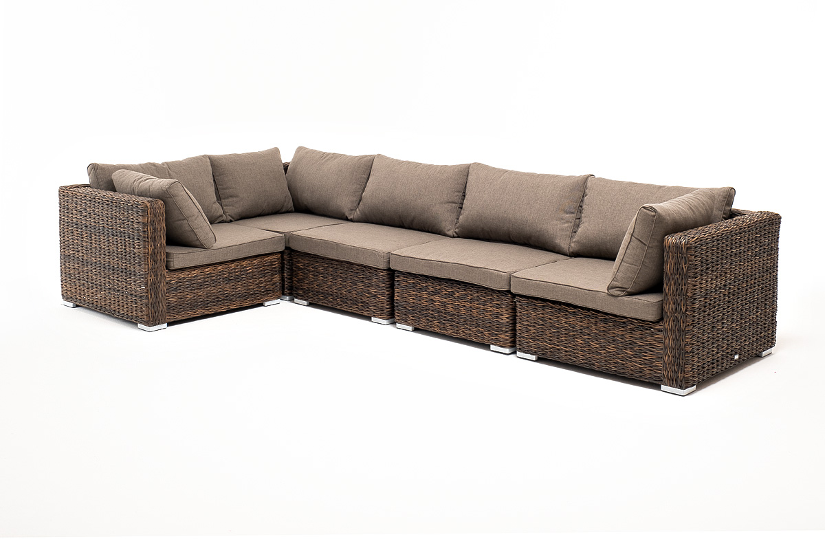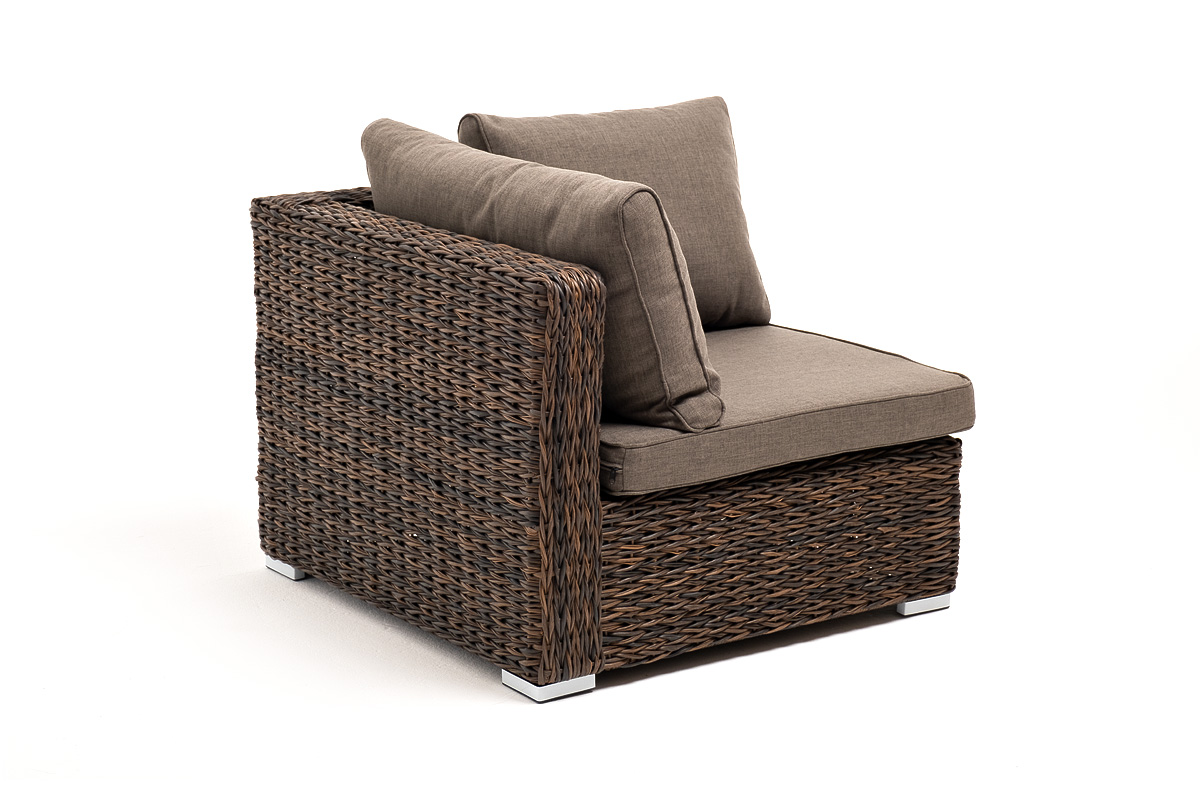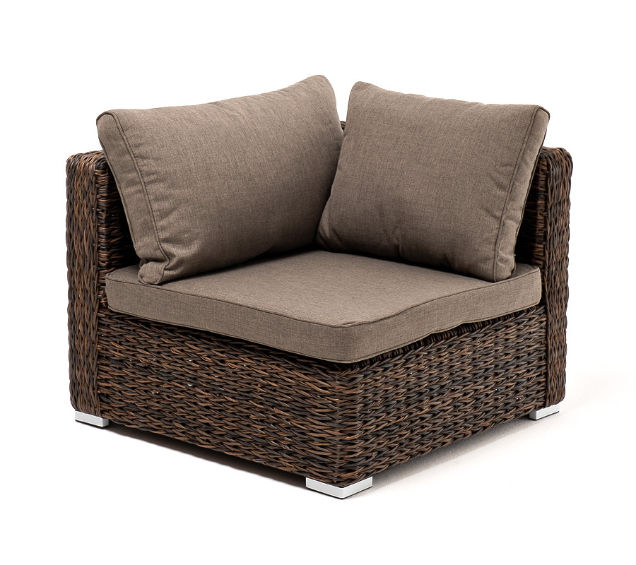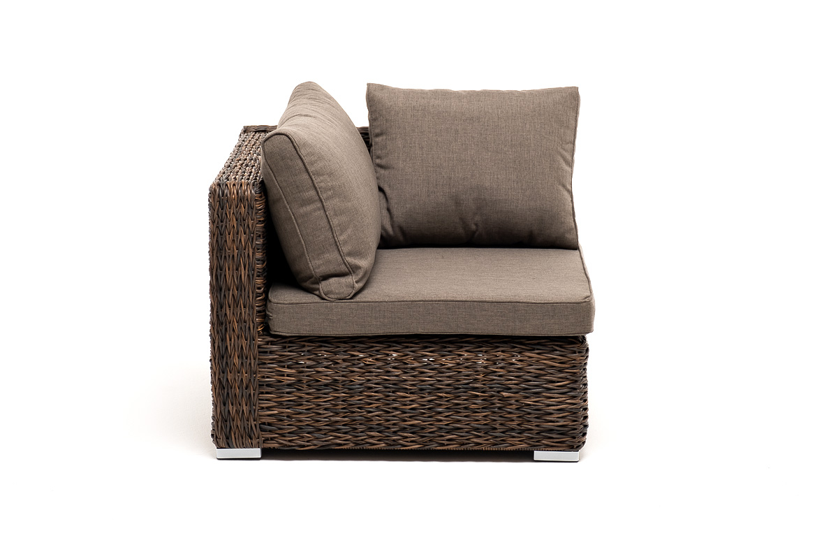 «Лунго» угловой модуль из искусственного ротанга вида «гиацинт», вляется неотъемлемой частью лаунж-зоны. В своем основании имеет каркас из алюминия, который вручную оплетен ротангом коричневого цвета.