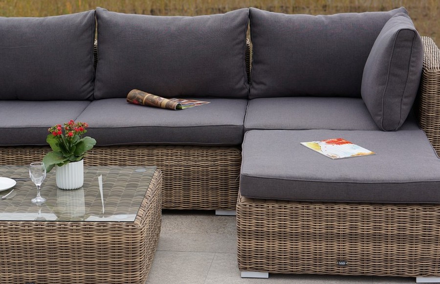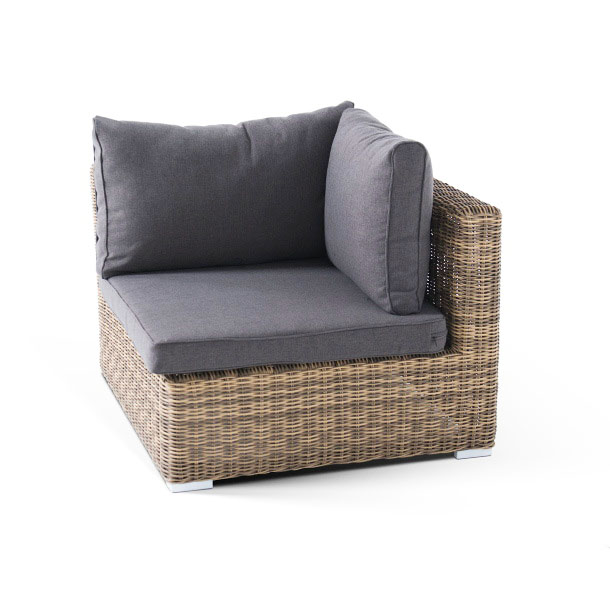 «Лунго» угловой модуль из круглого искусственного ротанга, является неотъемлемой частью лаунж-зоны, в своем основании имеет каркас из алюминия, который вручную оплетен ротангом натурального соломенного цвета.