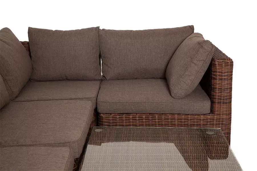 При изготовлении каркаса всех составляющих комплекта используется высокопрочный алюминий. Он дополнен круглым плетением из искусственного ротанга. Цвет – коричневый.