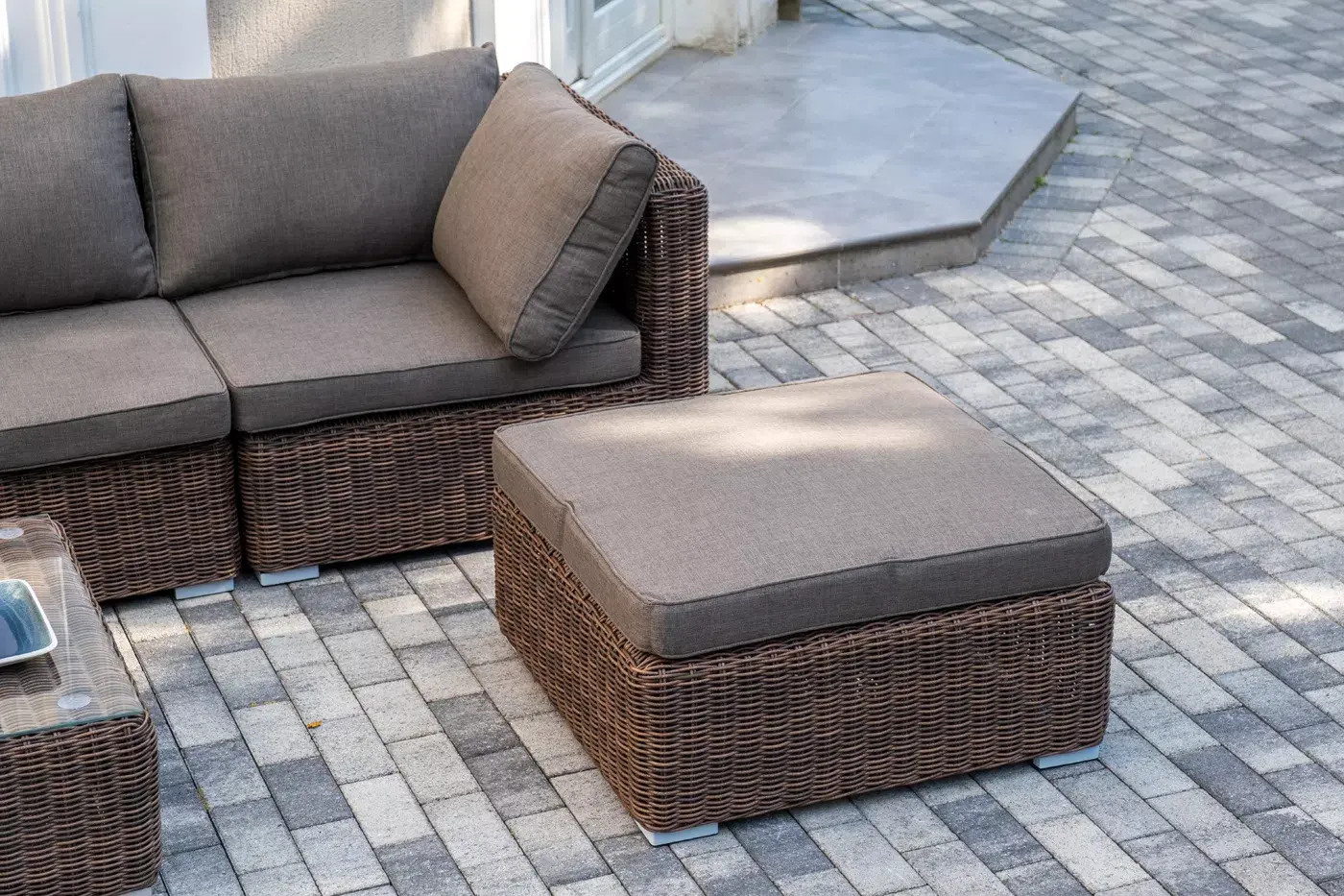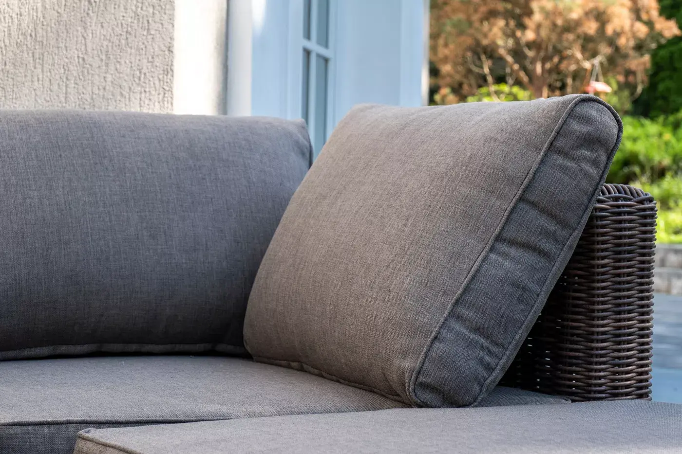 Модули дивана и оттоманка укомплектованы подушками со съёмными чехлами серого цвета. Они состоят из полиэстера с плотностью 300гр/м2. Защитные качества материала усилены путем его обработки влагоотталкивающими составами.