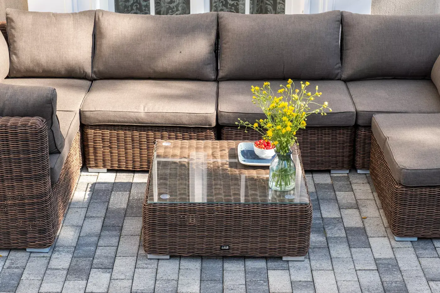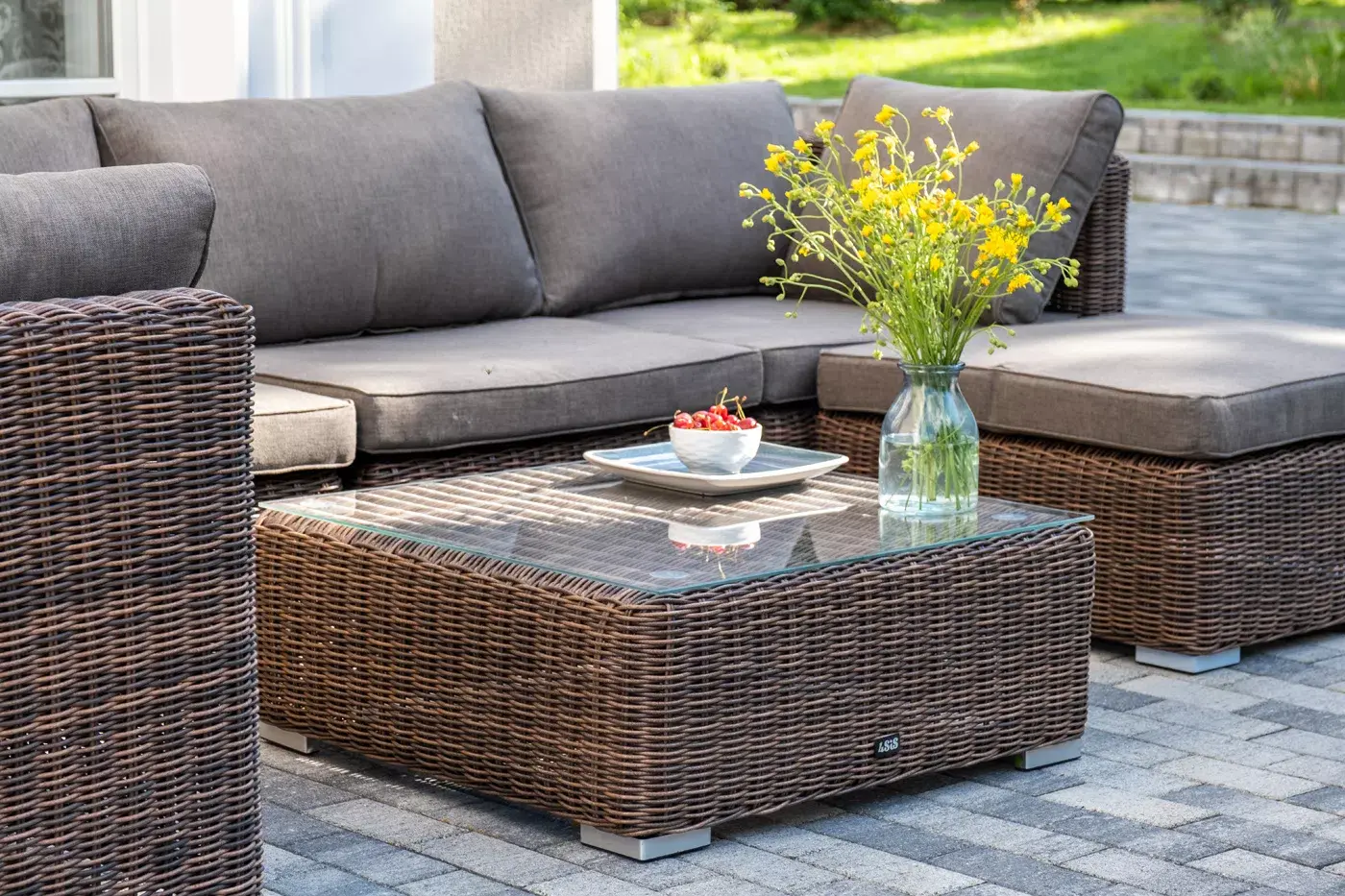 Плетеный столик имеет стеклянную столешницу, изготовленную из прочного закаленного стекла, толщина - 5 мм.