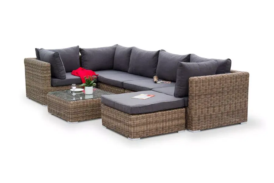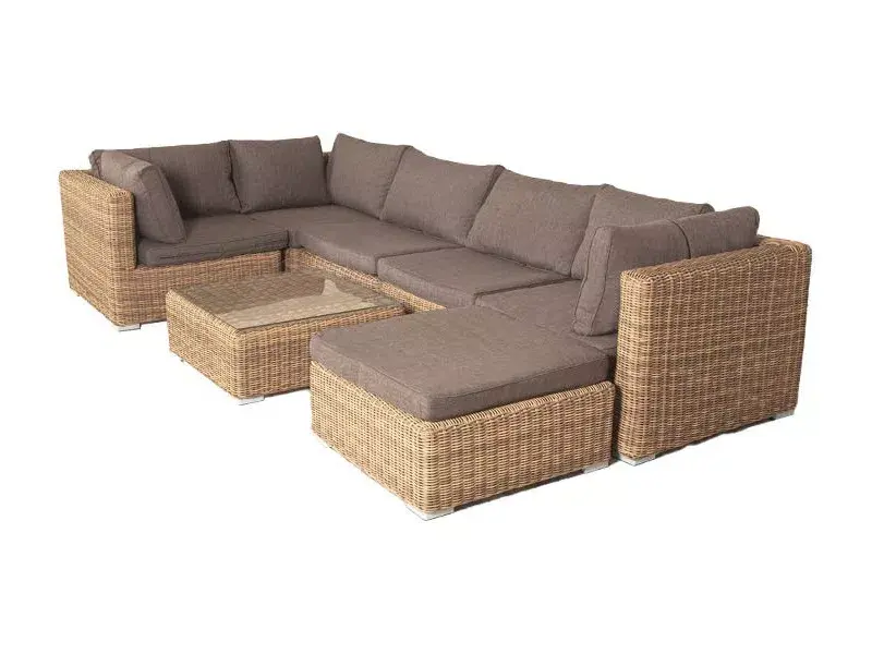 Облегченный алюминиевый каркас, вручную оплетенный долговечным искусственным ротангом натурального соломенного оттенка. Журнальный столик с прочной стеклянной столешницей толщиной 5 мм.