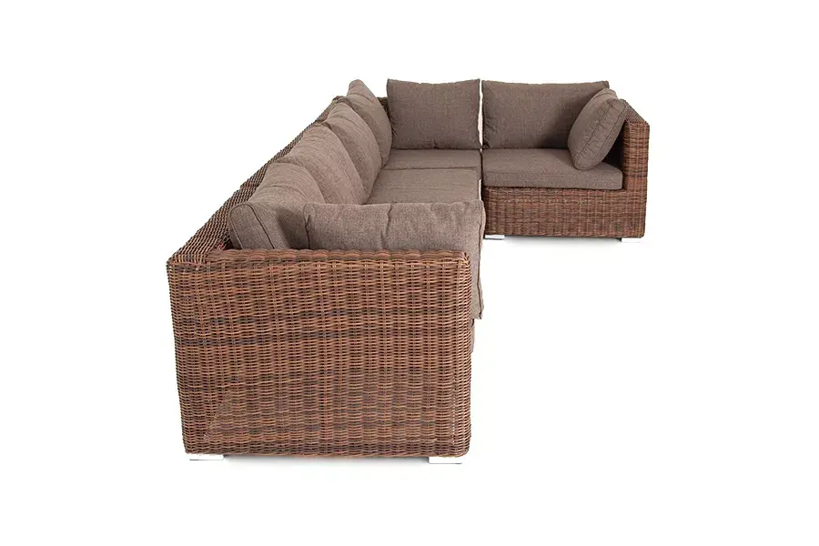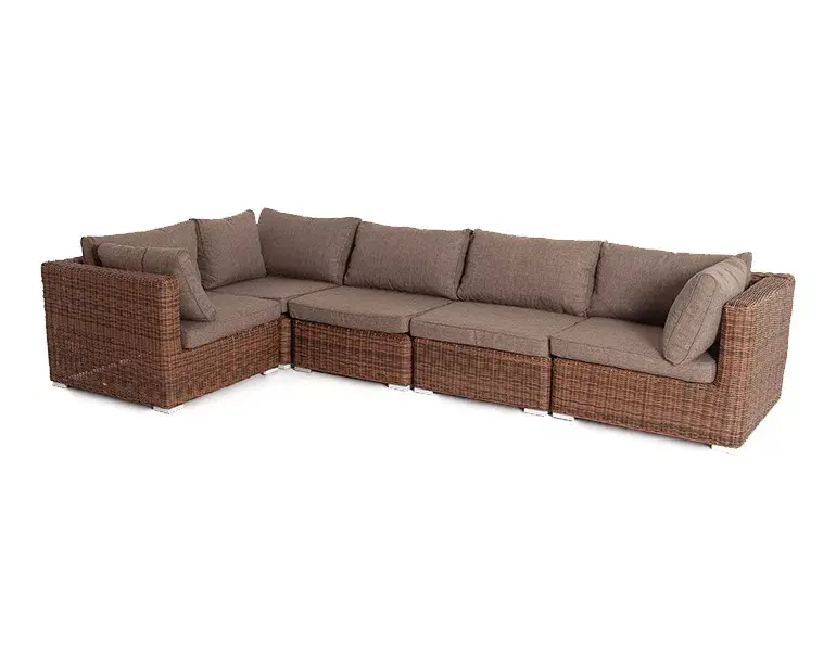 Диван из ротанга «Лунго» относится к группе трансформирующихся моделей, которые рассчитаны на большую компанию. Он состоит из набора модулей: трех угловых (размер – 860×860×650 мм) и двух прямых (740×860×650 мм).