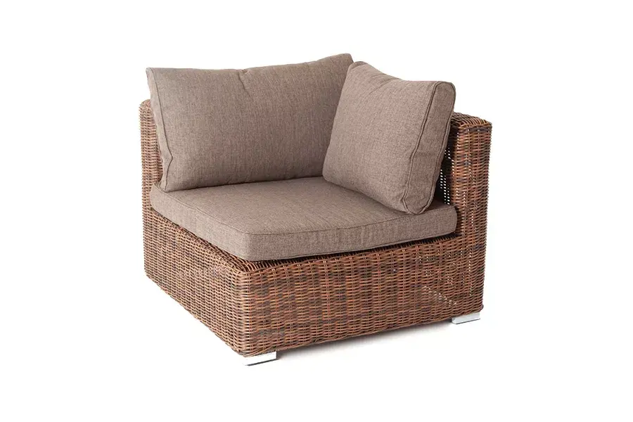 В качестве основы мебели используется алюминиевом каркас высокой прочности. Ее дополняет ручная оплетка, сделанная из круглого искусственного ротанга в коричневом оттенке.