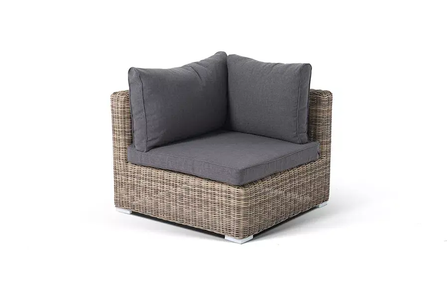 Модульный диван дополняют подушки со съёмными чехлами в сером оттенке. При их пошиве используется полиэстер, плотностью 300гр/м2. Ткань обрабатывается влагоотталкивающей пропиткой для усиления ее защитных качеств.
