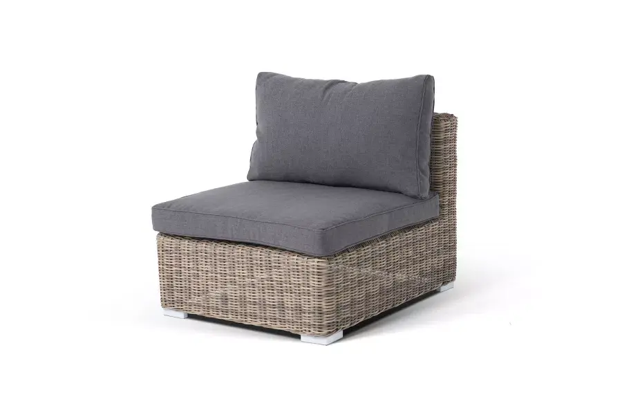 Комплект выполнен из круглого искусственного ротанга ручного плетения. Представлена в соломенном цвете.