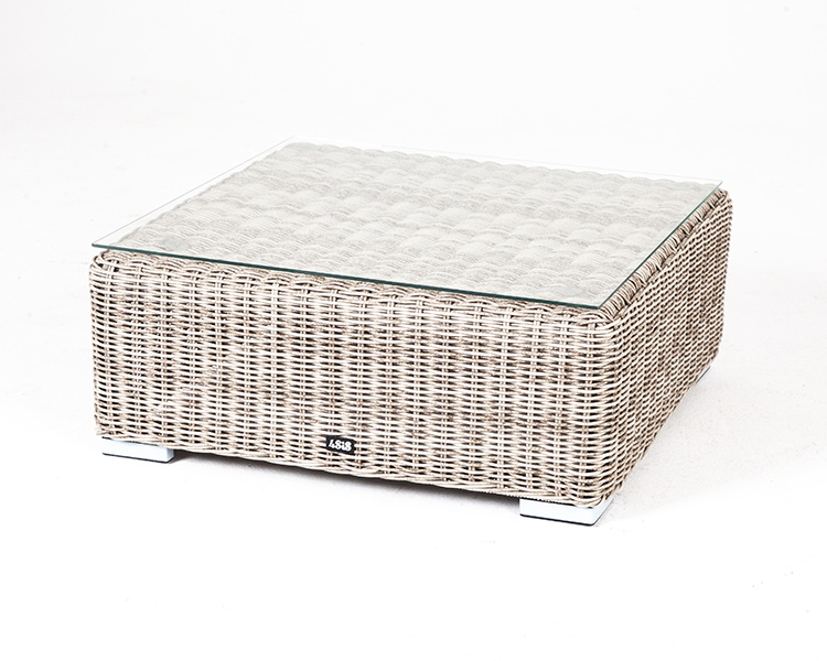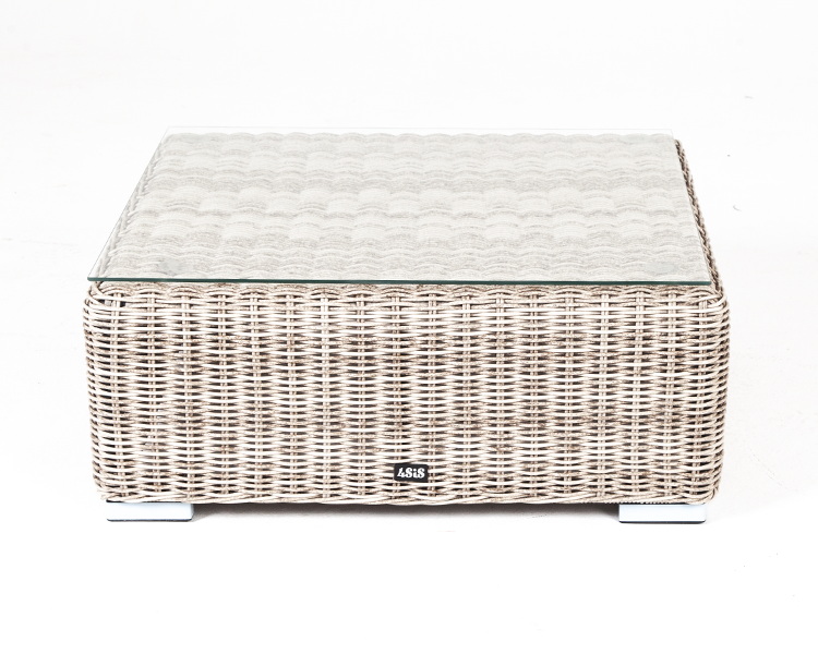 Стол изготовлен из алюминиевого каркаса, который оплетен вручную круглым искусственным ротангом бежевого цвета. Небольшие размеры (ширина и длина 74 см, высота 30 см) позволяют интегрировать в любое пространство для отдыха. Поверхность защищает столешница из ударопрочного стекла толщиной 5 мм.