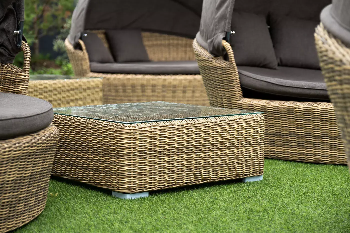 Компактные габариты позволяют удобно разместить мебельный элемент в месте с ограниченным свободным пространством. Столик имеет прочный алюминиевый каркас. Ручное круглое плетение сделано из искусственного ротанга и представлено в соломенном цвете.