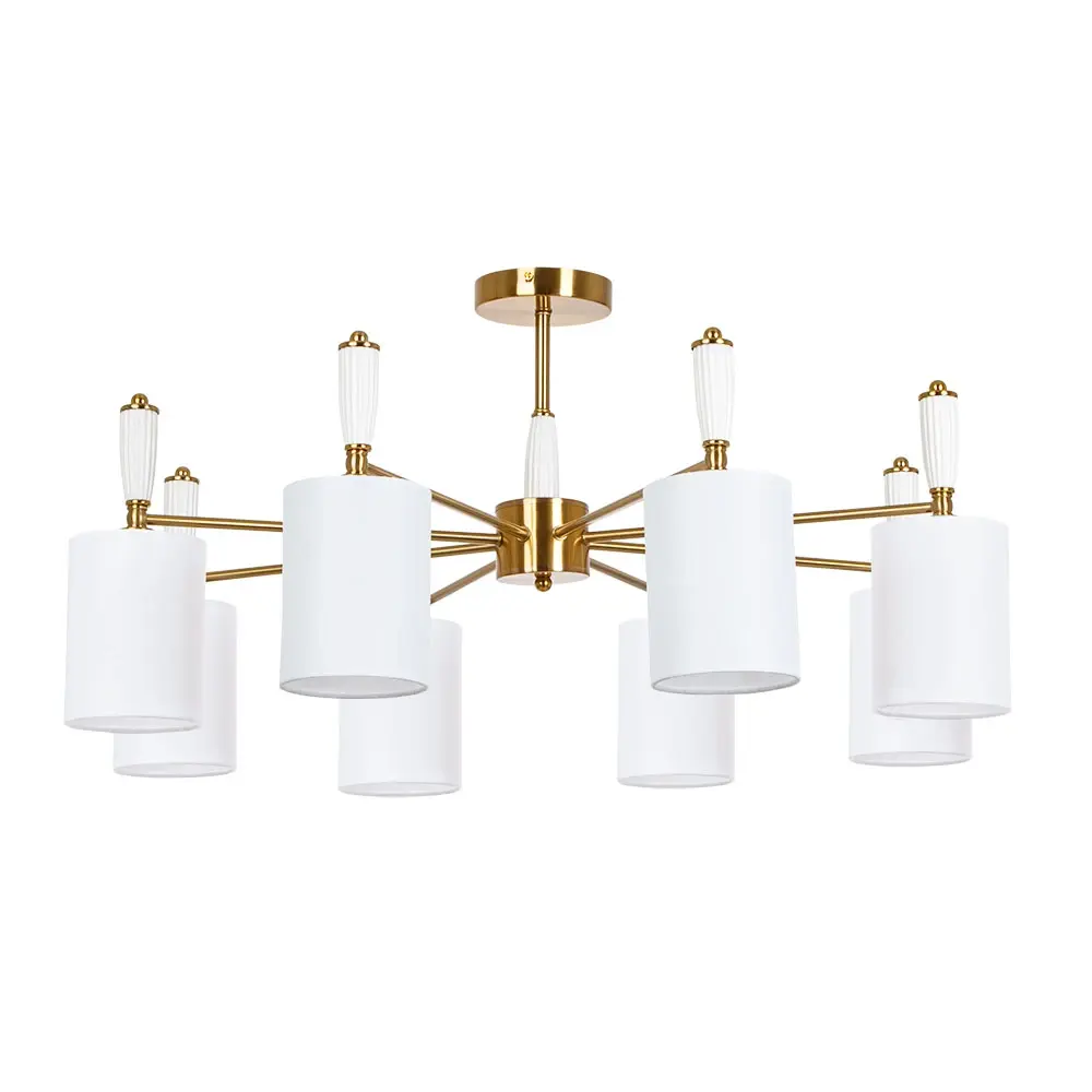 Люстра Arte Lamp A4102PL-8PB в стиле американская классика создаст уютную и теплую атмосферу. Модель на штанге с плафонами из белого текстиля направляет свет вниз, обеспечивая комфортное освещение. Отделка из керамики и металла медного цвета добавляет интерьеру солидности и ретро-шарма. Крепление на планке обеспечивает надежный монтаж на потолок. Люстра рассчитана на использование ламп накаливания. Гарантия производителя — 36 месяцев.