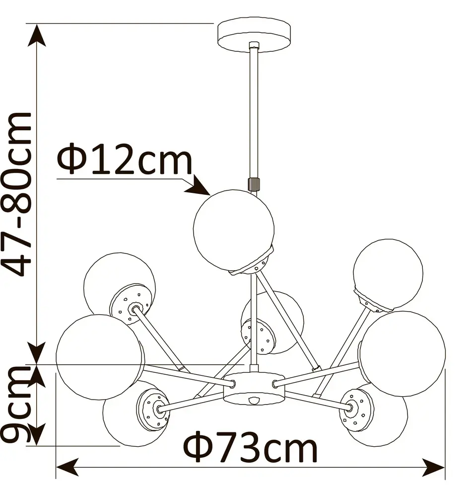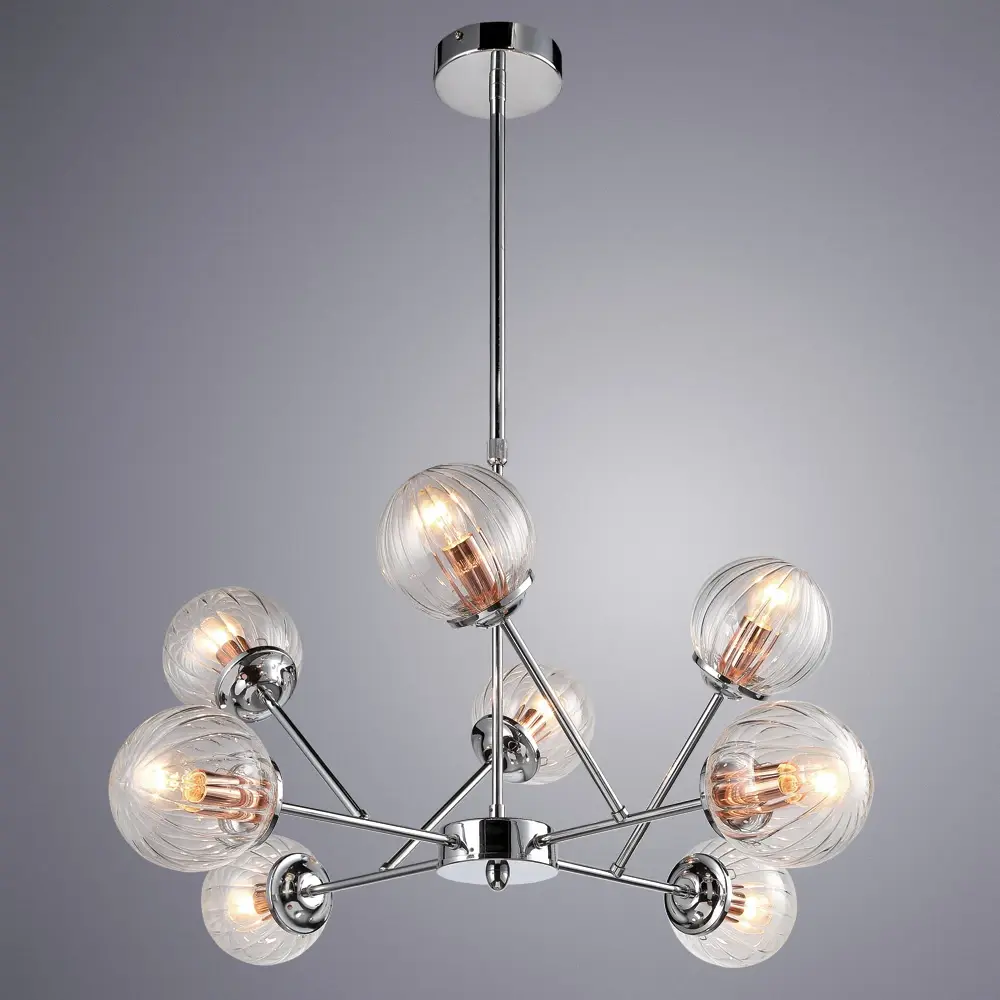 Люстра Arte Lamp A9276LM-8CC в стиле лофт. Конструкция на штанге с восемью прозрачными стеклянными плафонами. Свет направлен вверх и вниз, создавая равномерное освещение. Металлическая арматура хромированного цвета сочетается с современными интерьерами. Для монтажа на потолок используется планка. В светильнике установлены светодиодные лампы.