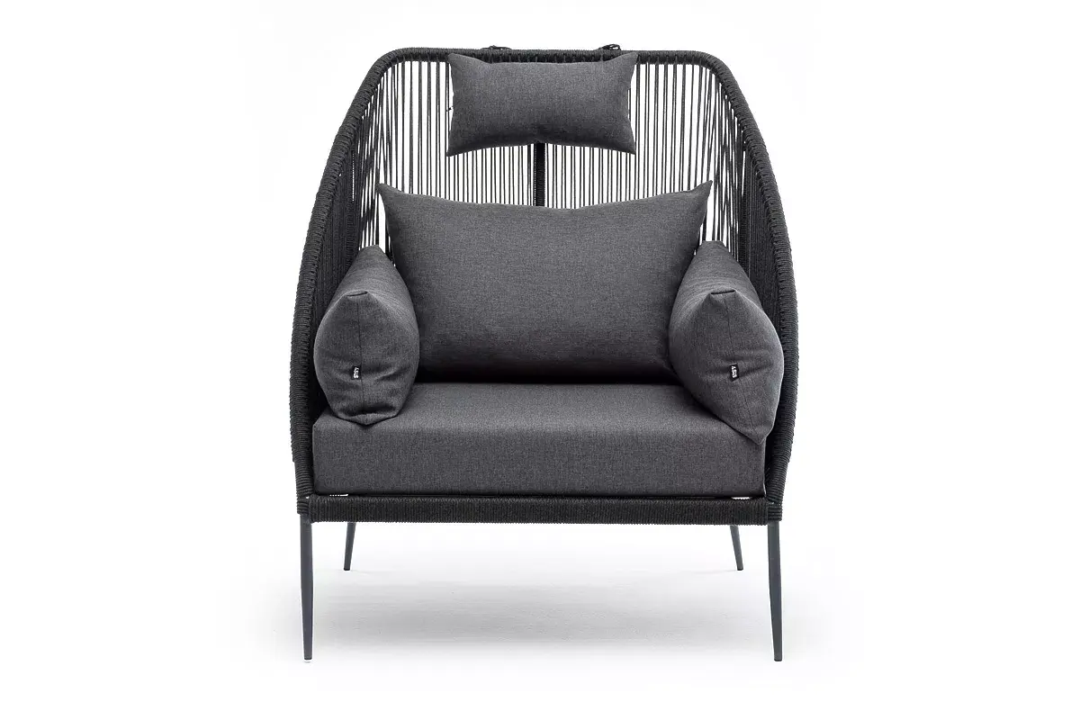Кресло имеет алюминиевый каркас, окрашенный порошковой краской в темно-серый (RAL7024) цвет. Боковины каркаса вручную оплетены роупом - эластичными синтетическими лентами, изготовленными из высокопрочных полиэфирных волокон. Цвет оплетки - темно-серый.